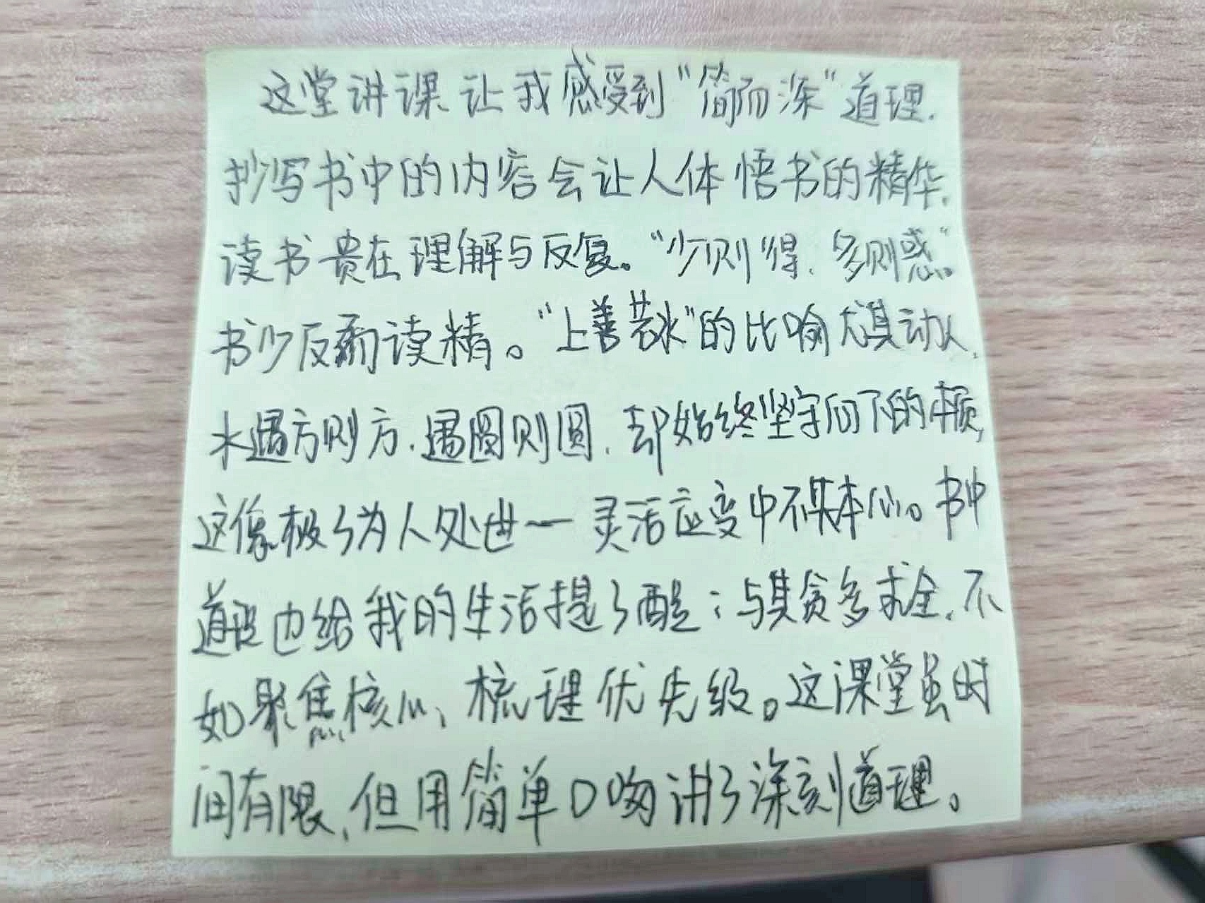 在10月23日下午的读书会上,李红霞老师带我们走进了《道德经》的智慧殿堂,近70位同学参与。她的讲述亲切而深刻,让千年前的文字变得鲜活起来,如同一次润物无声的心灵洗礼,让大家真切地感受到了经典的力量。